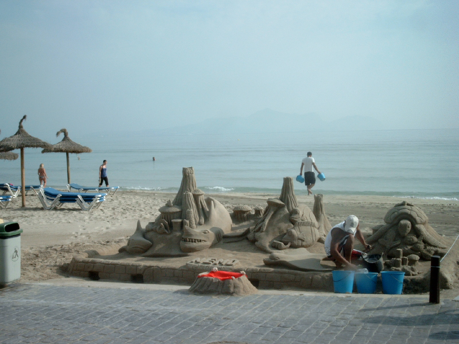 Auf der rechten Seite einen Blick vom Eingangsbereich unseres Hotels. Der Strandbereich in Can Picafort wurde zu einem Großteil von Sandburgen in Beschlag genommen. Darunter waren wirklich sehenswerte „Bauten“.